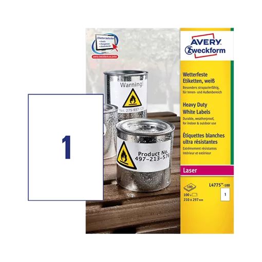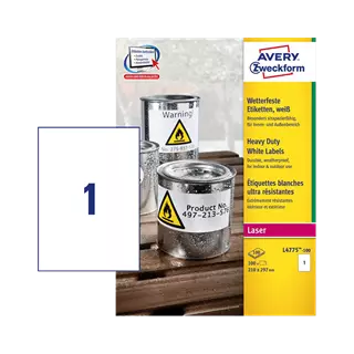Šírka etikety: 210 mm • Výška etikety: 297 mm • Materiál etikety: Plast • Typ lepidla: Silný • Farba: Biela