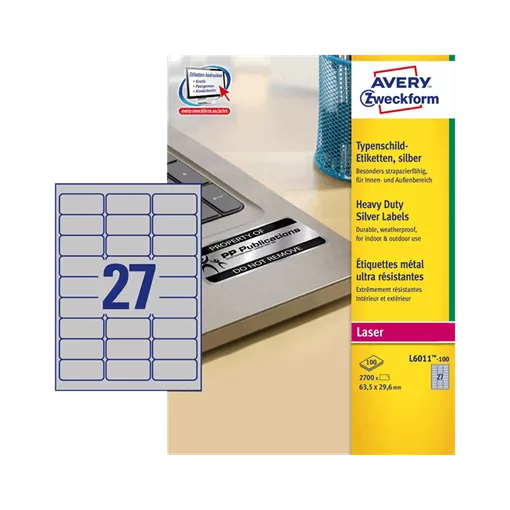 Šírka etikety: 63.5 mm • Výška etikety: 29.6 mm • Materiál etikety: Syntetické • Typ lepidla: Silný • Farba: Strieborná