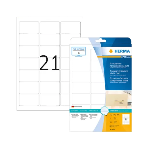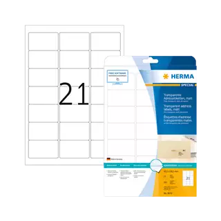 63.5 mm x 38.1 mm Syntetické Samolepiace etikety A4 Herma Priehľadná (čistá voda) ( 25 hárkov/balenie )