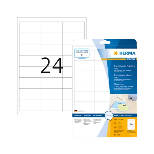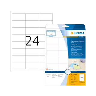 66 mm x 33.8 mm Syntetické Samolepiace etikety A4 Herma Priehľadná (čistá voda) ( 25 hárkov/balenie )