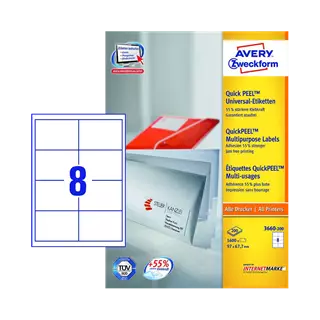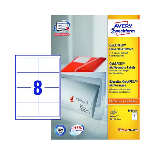 97 mm x 67.7 mm Papierové Samolepiace etikety A4 Avery Zweckform Biela ( 200 hárkov/balenie )
