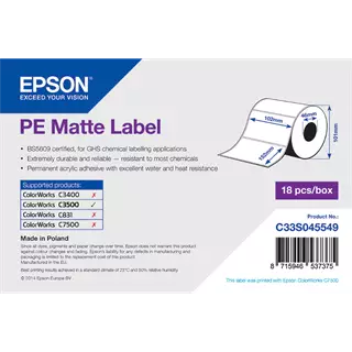 Šírka etikety: 102 mm • Výška etikety: 152 mm • Materiál etikety: Syntetické • Vnútorný priemer cievky: 40 mm • Typ lepidla: Štandardná • Farba: Biela