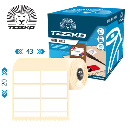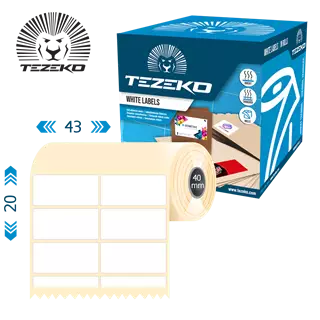 Šírka etikety: 43 mm • Výška etikety: 20 mm • Materiál etikety: Plast • Vnútorný priemer cievky: 40 mm • Typ lepidla: Štandardná • Farba: Biela
