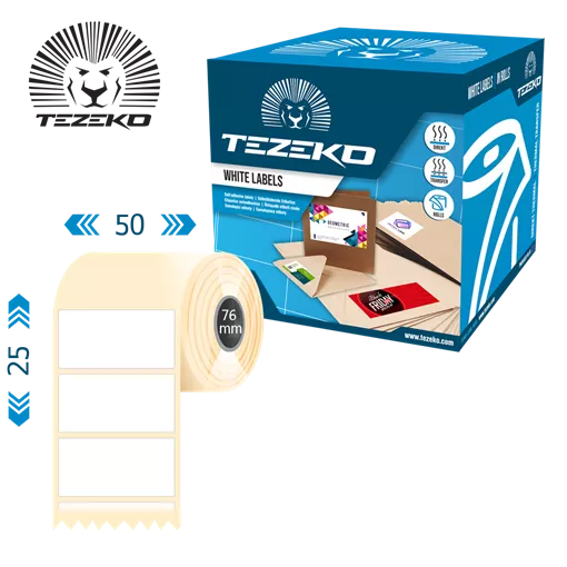 Šírka etikety: 50 mm • Výška etikety: 25 mm • Materiál etikety: Termo etikety • Vnútorný priemer cievky: 76 mm • Typ lepidla: Štandardná • Farba: Biela